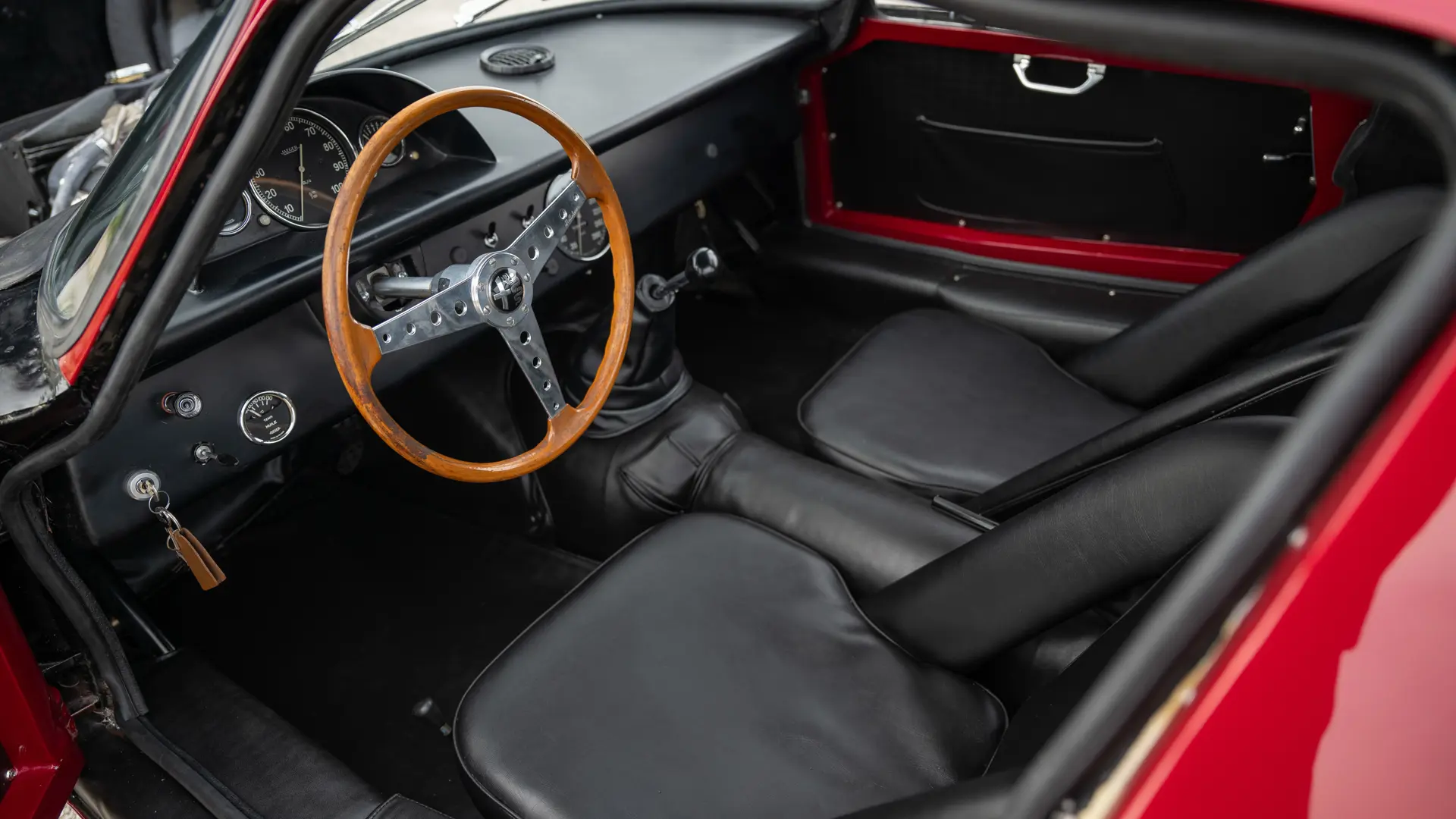 Draping this cutting-edge mechanical package was a body of breathtaking, brutalist beauty crafted by Carrozzeria Zagato. The young aerodynamicist Ercole Spada was given a singular directive: make it slip through the air. Hand-beaten from ultra-thin aluminum, the TZ1 featured a low, sweeping shark-like nose that guided the air over a compact, domed glasshouse. But Spada’s true masterstroke was located at the rear. He applied the aerodynamic theories of Dr. Wunibald Kamm, creating the Coda Tronca—a sheer, abruptly chopped-off tail section. This design tricked the airflow into behaving as if the car possessed a long, teardrop-shaped tail, drastically reducing aerodynamic drag while simultaneously enhancing high-speed stability. The interior of the TZ1, whether in Stradale or Corsa specification, was an exercise in pure functional minimalism. Deep buckets, a large wood-rimmed steering wheel, exposed tubular chassis sections, and a dashboard dominated by vital Veglia instruments reminded the pilot that this was a homologation special, designed first and foremost to conquer the stopwatch.